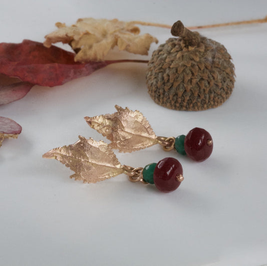 Autumn Leaf Earrings, Solid 9ct Rose Gold and Emerald Earrings