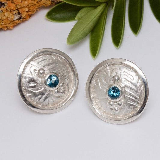 Boudicca Warrior Queen Celtic Shield Earrings, Blue Topaz Earrings