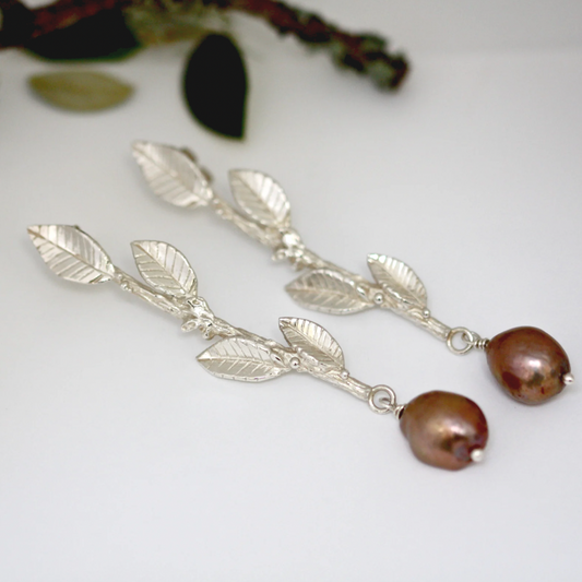 Statement Silver Laurel Leaf and Pearl Earrings, Long Drop Wedding Earrings