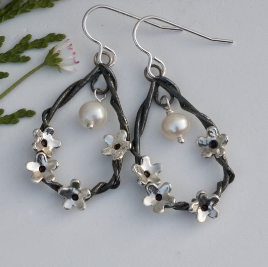Teardrop Woodland Silver Flower Dangle Earrings, Silver Statement Drop Earrings
