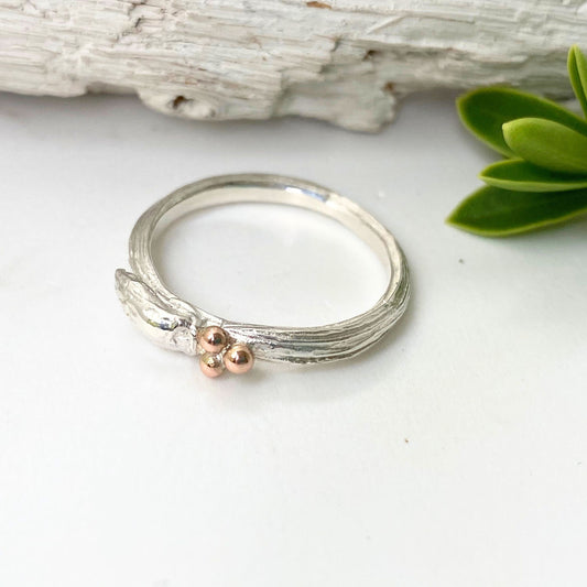 Willow Twig Bud Ring, Silver and Rose Gold Wedding Ring, Nature Stacking Ring