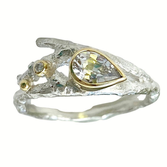 White Sapphire Elvish Twig Ring-Pear Shape Ring-Silver and 18ct Gold, Diamond