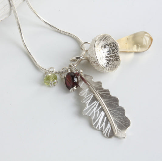 Woodland Oak Leaf and Acorn Cup Cluster Necklace-Garnet-Peridot-Citrine-Handmade Nature Jewellery