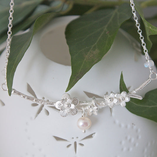 Cherry Blossom Necklace, Silver, Pearl and Moonstone Bridal Necklace