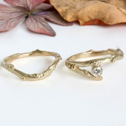 Gold and Diamond Twig Engagement Ring Set, Elvish Engagement and Wedding rings