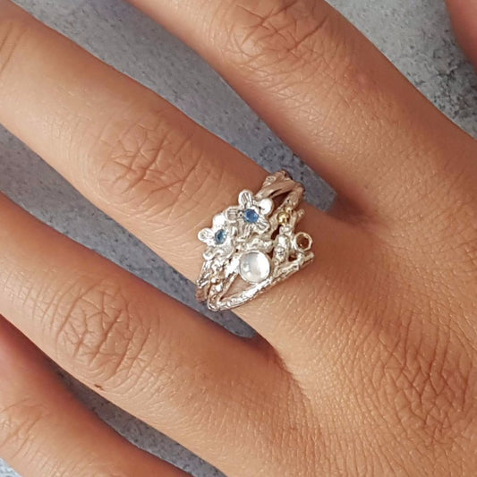 Enchanted Wood Forget Me Not Cluster Ring-Elvish Sapphire and Moonstone Ring