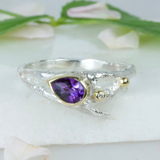 Elvish Twig Engagement Ring-Pear Shape Silver and Gold Engagement Ring