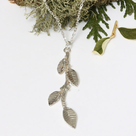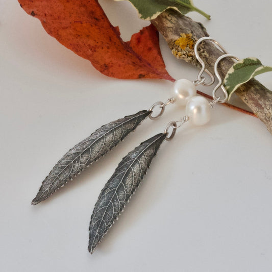 Long Boho Sterling Silver Leaf and Pearl Earrings-Woodland Leaf Earrings