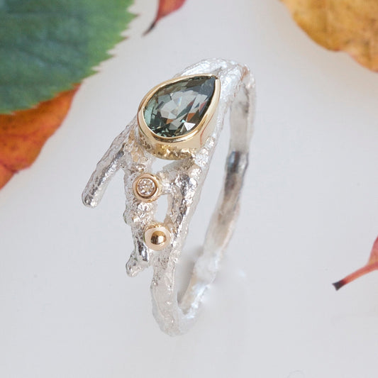 Green Sapphire Elvish Twig Ring-Pear Shape Ring-Silver and 18ct Gold, Diamond