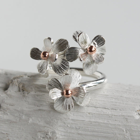 Handmade Adjustable Silver and Rose Gold Daisy Flower Ring-Floral-Botanical Ring