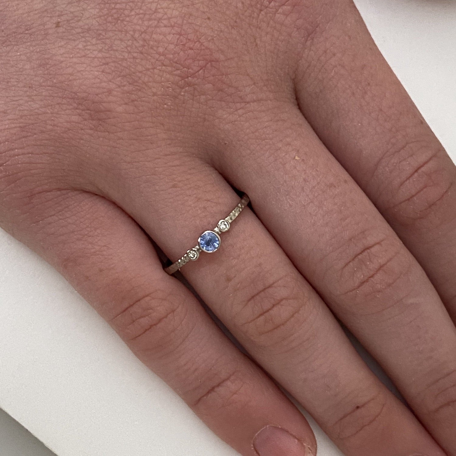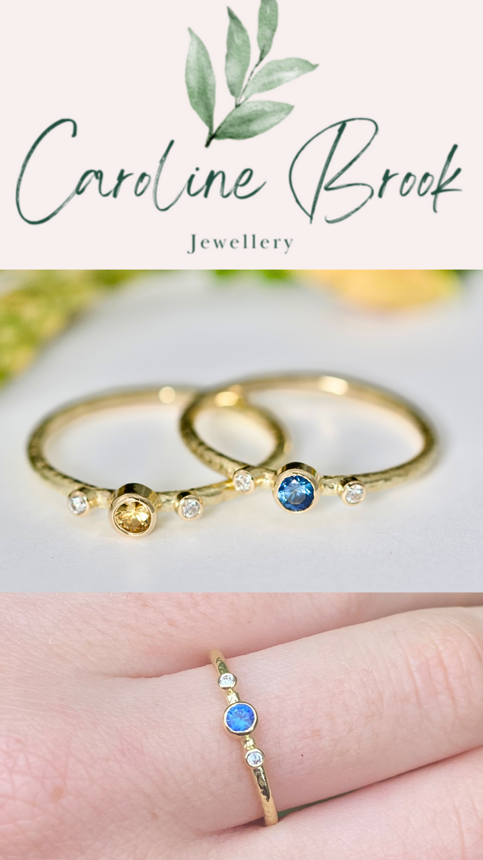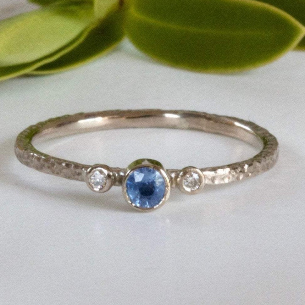 Discover our beautifully crafted Dainty 18ct Gold Diamond and Sapphire Trilogy Ring, perfect for commemorating a new union or celebrating your children. This elegant piece has been meticulously hand forged and features a slim textured band. Two small diamonds flank a bezel-set Sapphire at the centre, symbolising the enduring love between you and your partner. This ring can also be customized with other gemstones to mark special milestones in your life. Pair it with a handmade matching wedding band for a stunning and meaningful engagement ring set.