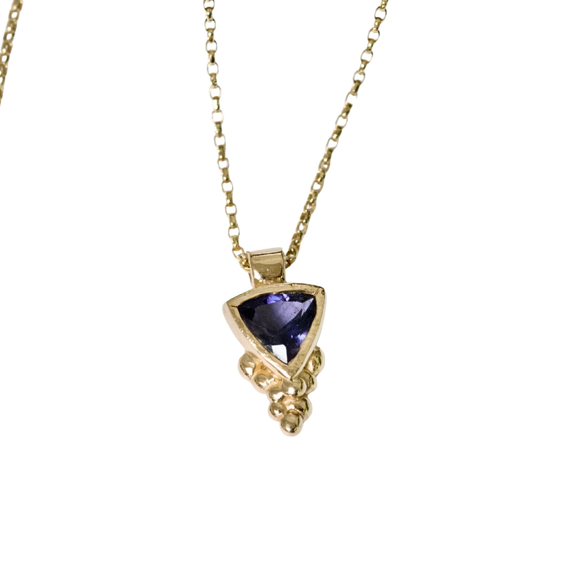 This handcrafted pendant showcases a natural trillion-cut Iolite gemstone mounted in a hand made 9ct solid gold setting with a cluster of berries surrounding the base. Iolite's characteristic deep indigo tone and optical properties have garnered increased appreciation within fine jewellery circles. This one-of-a-kind piece is individually created and supplied complete with an 18-inch solid gold oval link chain. Next-day dispatch is available for this distinctive, ready to wear creation making it a perfect luxury gift.